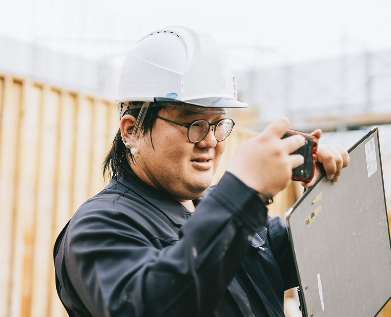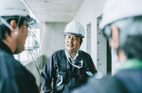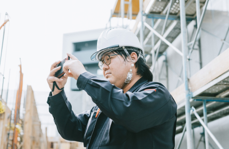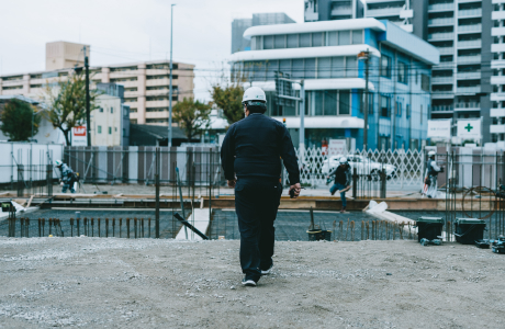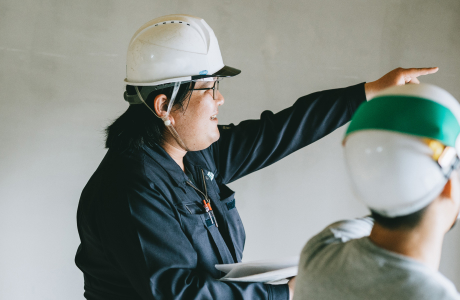 現場の巡視へ。進捗を確認して、ここが良い、ここは悪いから改善しよう、ここは無駄なものがある、などの指示も行います。現場に部下がいる場合は、確認事項を共有します。