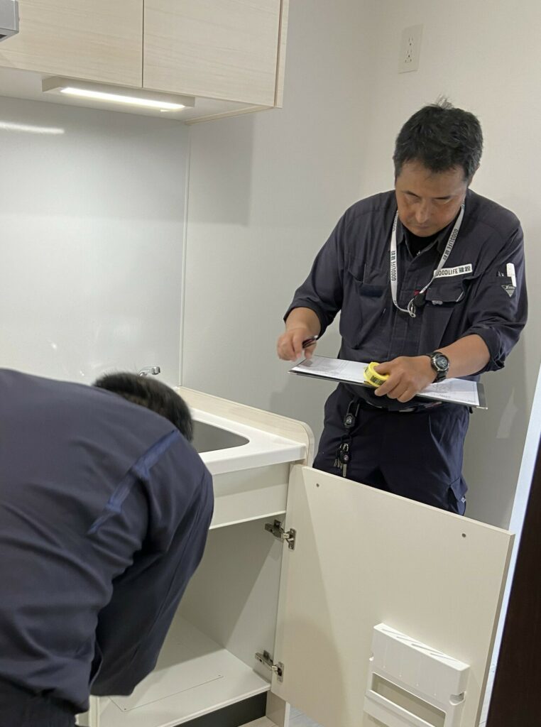 こちらは、キッチンの排水管がきちんと接続されているか確認しているところですね。