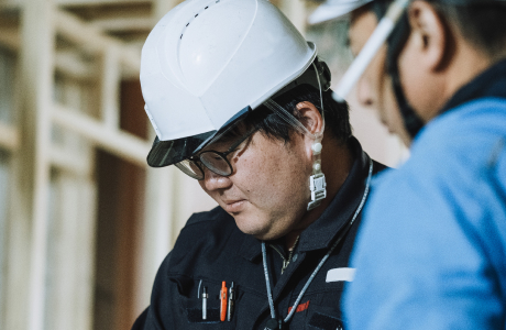 現場の巡視へ。進捗を確認して、ここが良い、ここは悪いから改善しよう、ここは無駄なものがある、などの指示も行います。現場に部下がいる場合は、確認事項を共有します。